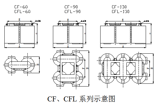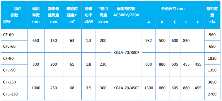 四、CF、CFL系列懸掛式電磁除鐵器主要技術參數、外形尺寸